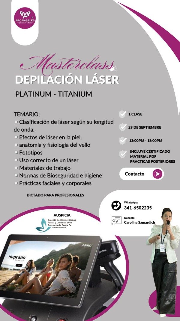 Temario: Depilación definitiva en técnicas de uso PLATINUM - TITANIUM Rejuvenecimiento láser NIR. Diferencias entre ipl y láser. Anatomía y fisiología del pelo y piel. Precauciones y contraindicaciones. Espectro de luz. Técnicas y prácticas de